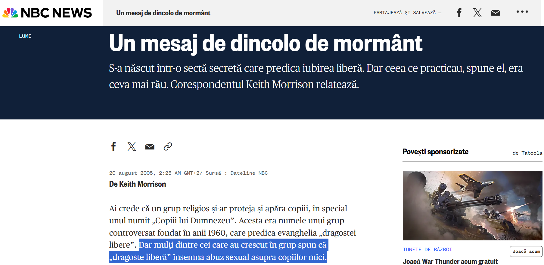 Articolul cu pricina a prezentat doctrina si modul de viata al sectei internationale "Copiii lui Dumnezeu" sau "Familia". In urma anchetei jurnalistice am reusit sa descoperim o celula a acestei secte in localitatea Agigea.