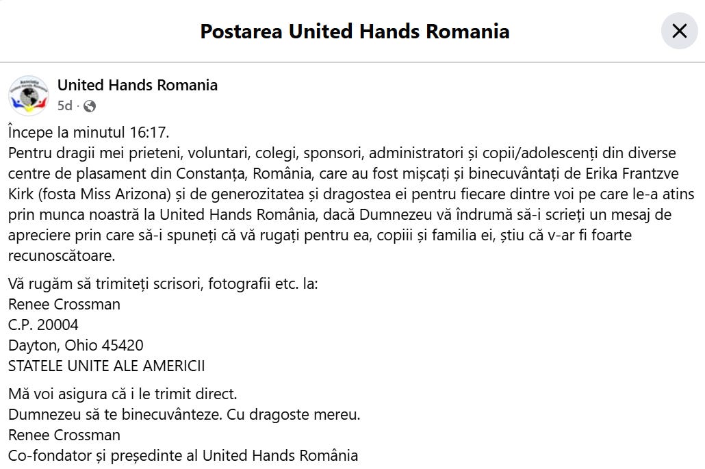 „Este o binecuvântare să colaborez cu Asociaţia United Hands România pentru acest proiect, în fiecare an. Renee Crossman şi echipa ei sunt adevăraţii eroi” - Erika Frantzve, Miss Arizona USA.